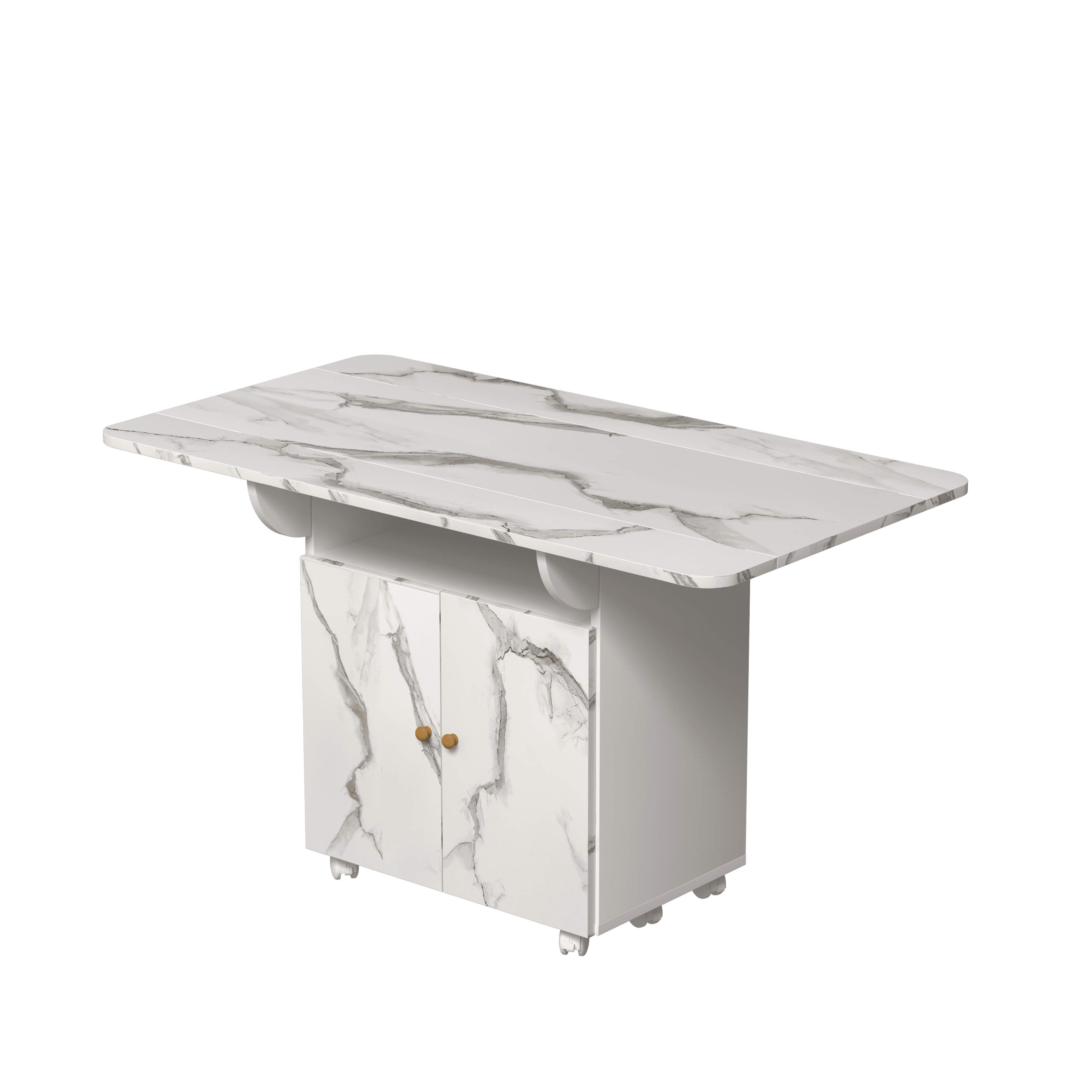 Home > 47" Wood Folding Dining Table with storage rack and cabinet, Removable Entryway Table with 6 Wheels, White Marble Color Kitchen Island