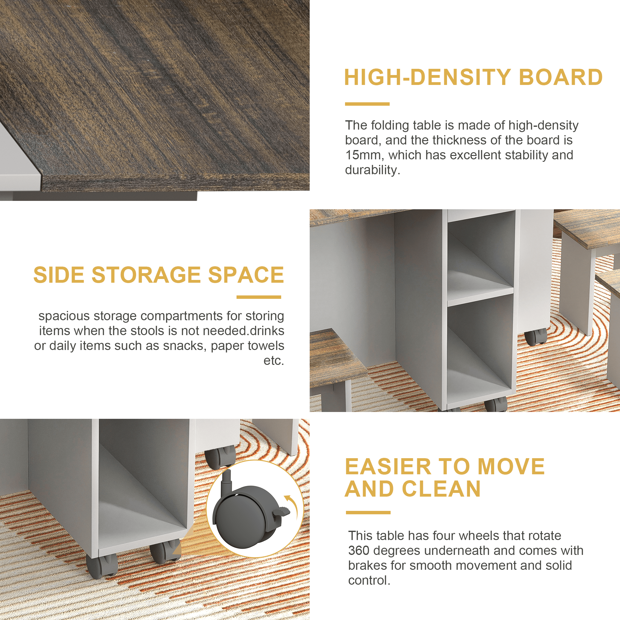 Sturdy and movable folding table: The folding table is made of high-density board, and the thickness of the board is 15mm, which has excellent stability and durability. This table has four wheels that rotate 360 degrees underneath and comes with brakes for smooth movement and solid control.