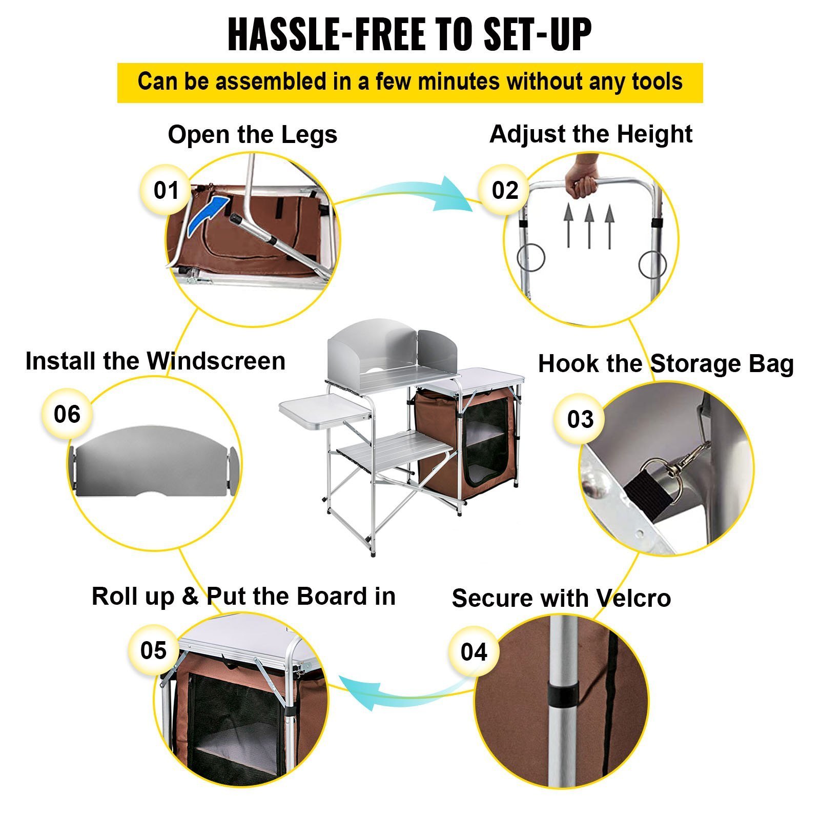 Our portable kitchen is hassle-free to assemble and convenient to disassemble for storage after use. Our convenient storage bag allows you to effortlessly gather the disassembled parts and store them indoors.