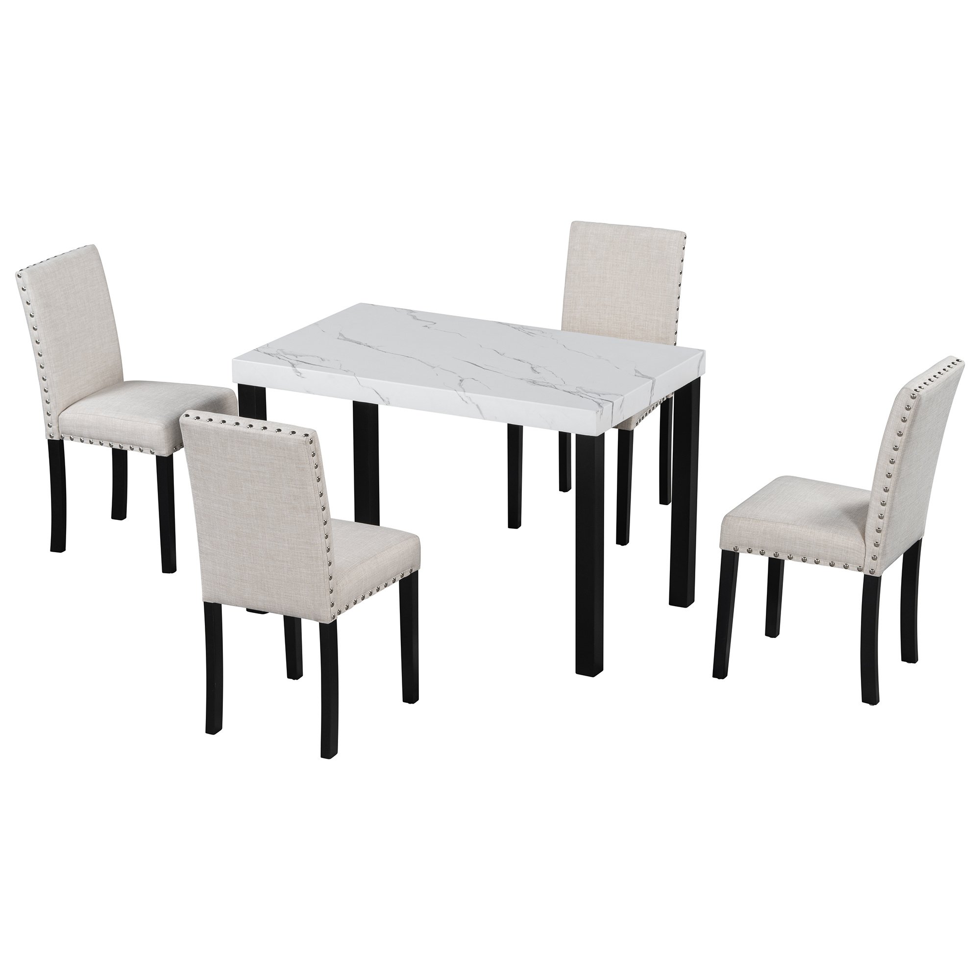 CLASSIC AND SIMPLE STYLE: The 5-piece wooden dining table set features stunning wood veneer and faux marble finish, giving it a charming, simple look. And it is suitable for various occasions such as kitchen, restaurant, tea room and so on.