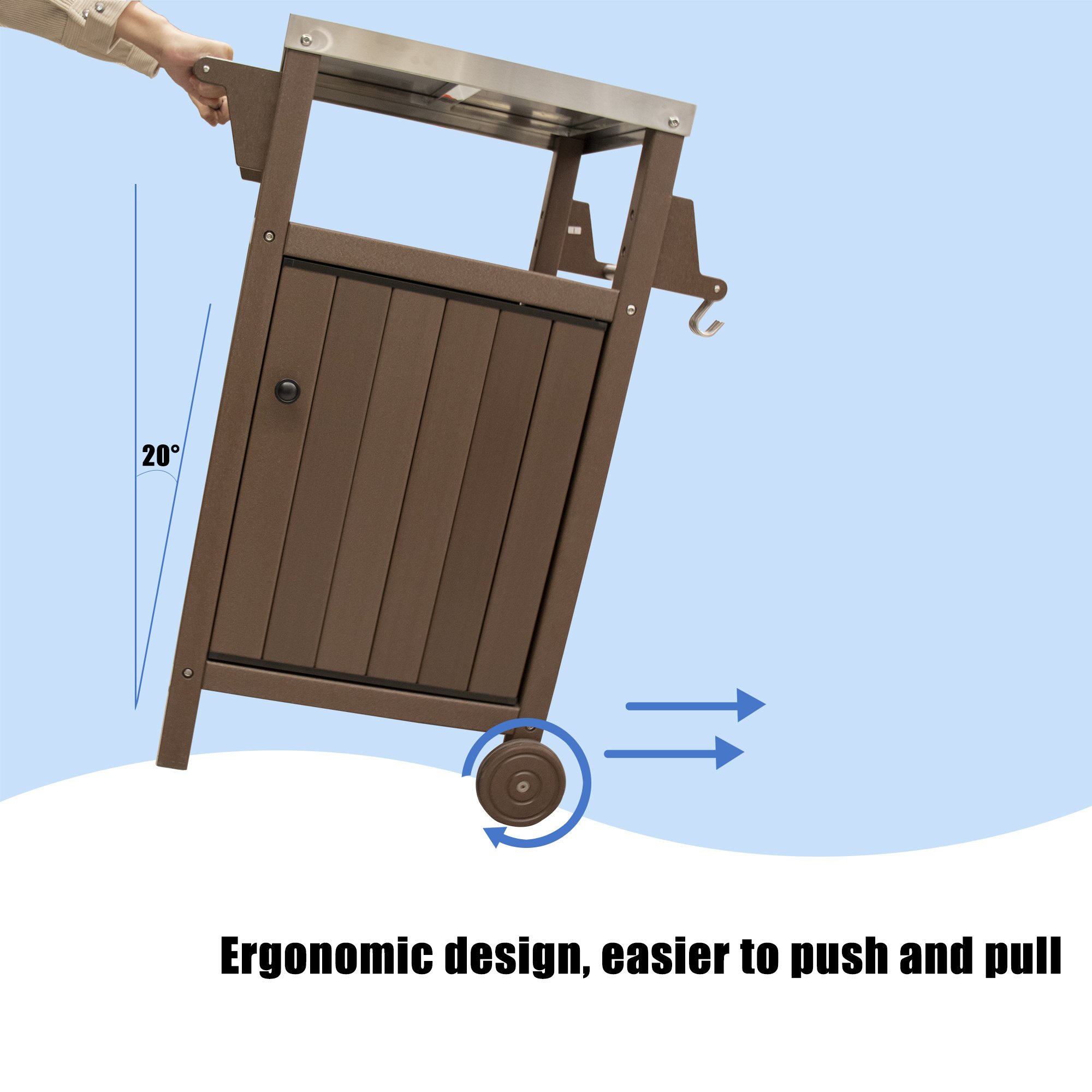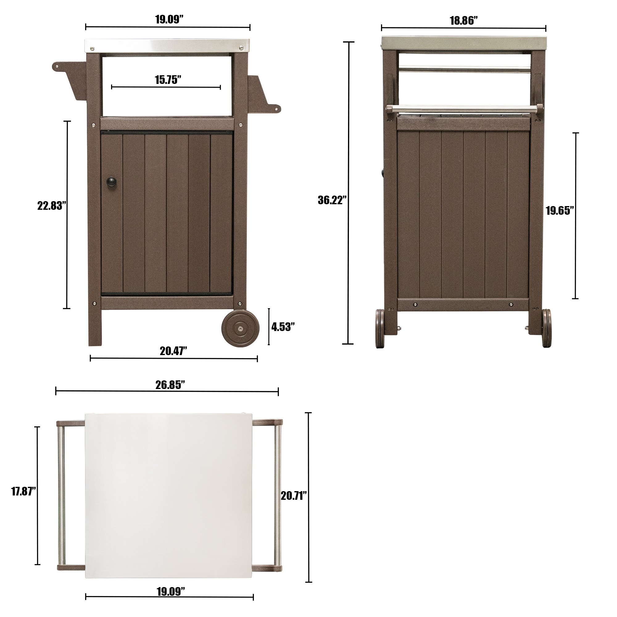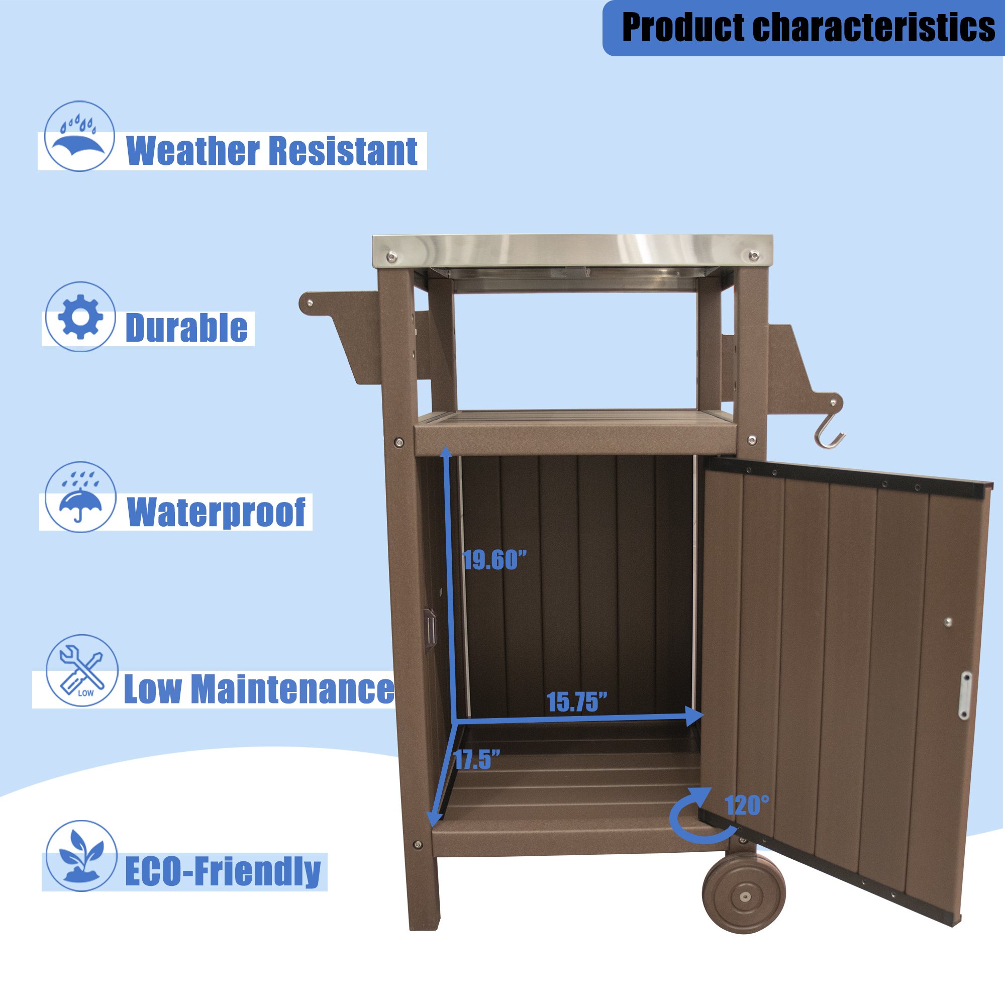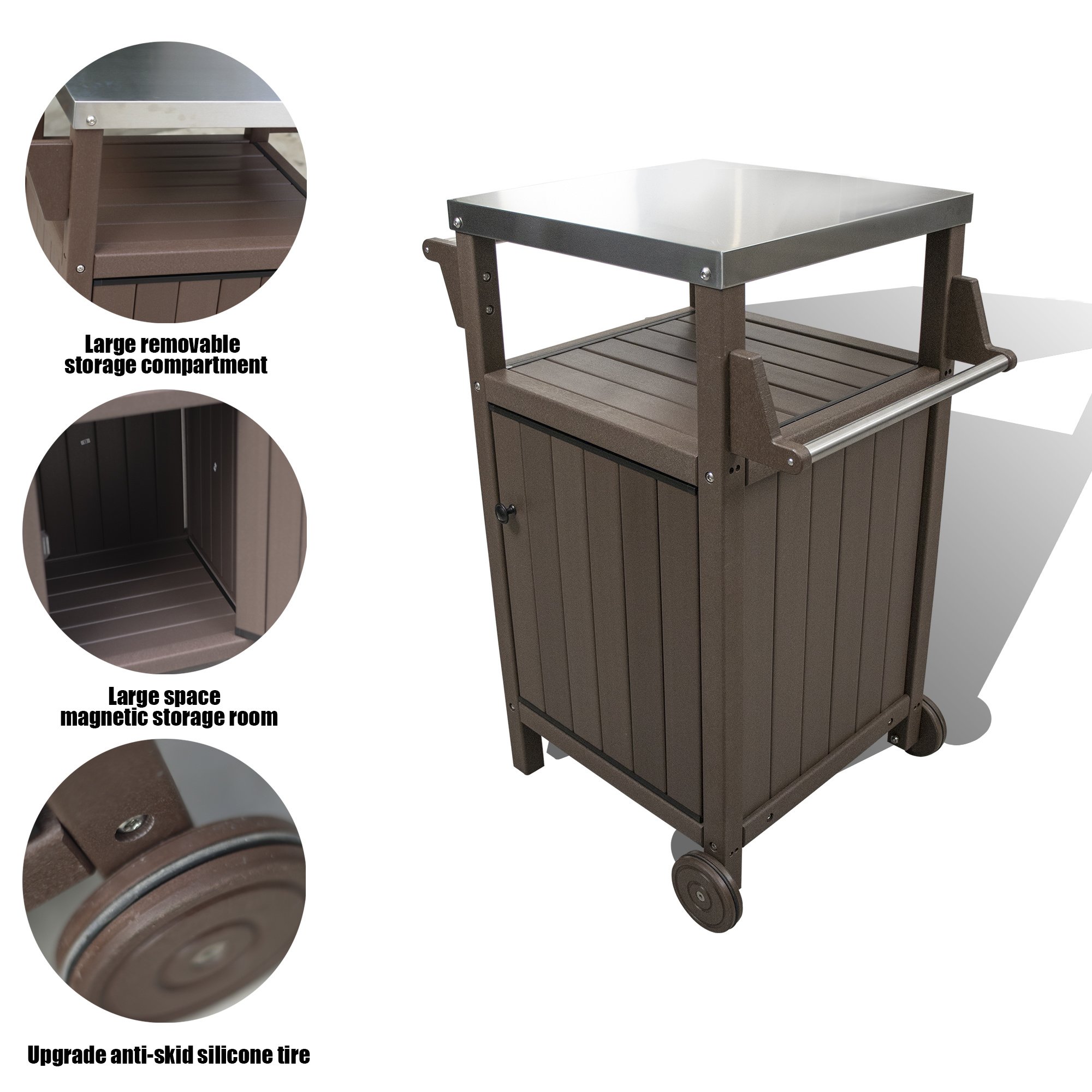 HDPE Barbecue/Grill Side Table Trolley; Outdoor Prep Dining Table Serving Cart with 304 Stainless Steel Top; Outdoor Kitchen Storage Island for Gard