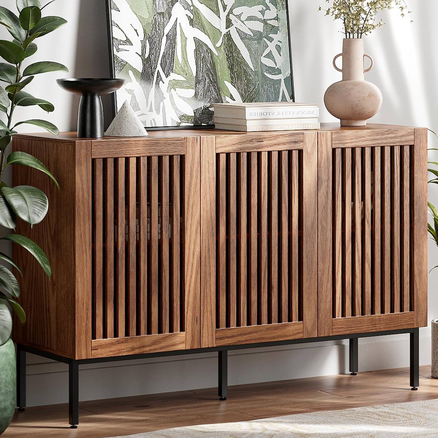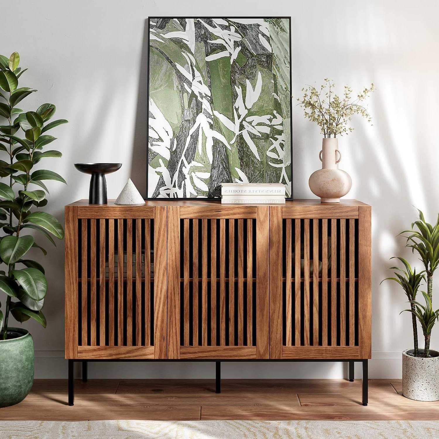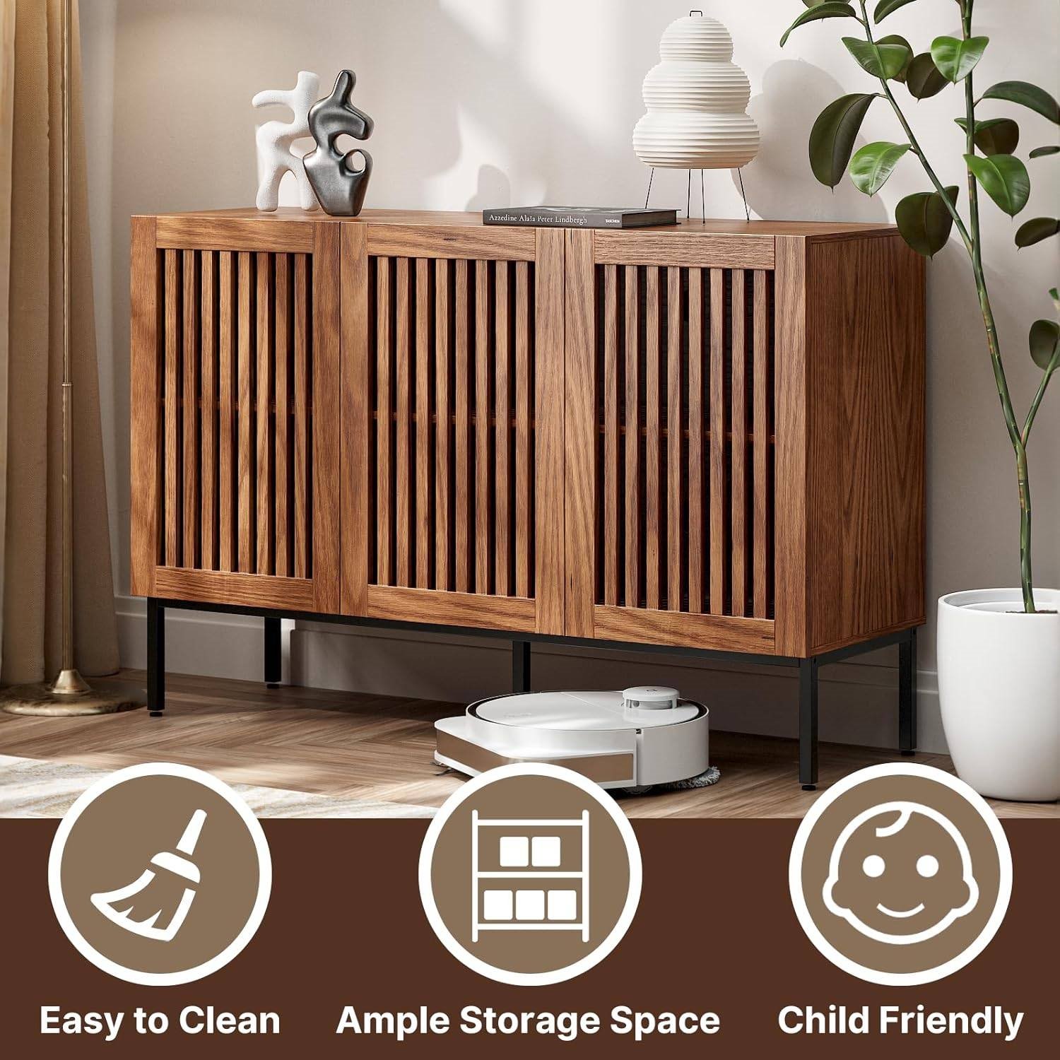 This Mid-Century Modern Dining Buffet Storage Cabinet Sideboard in Brown Wood Finish, adorned with grille-striped doors, embodies a unique design that effortlessly blends the rustic charm of the countryside with modern elegance. Not only a buffet cabinet but also an eye-catching storage sideboard. It serves as a captivating focal point in your living room, dining room, or office, adding a touch of style and functionality to any space. Boasting four spacious compartments and adjustable shelves, our storage cabinet offers ample room for all your belongings. Organize and stash away everything from books to clothes, toys to home decor, all while maintaining a tidy and stylish appearance. Brown accent cabinet whole is made of high-quality MDF wood, which is waterproof, scratch-resistant and wear-resistant. Metal legs is sturdy and stable, long-lasting construction and easy to clean. which is strong enough to stand the microwaves, mixers, blenders and even coffee machines. At the same time,it will separate the cabinet from the ground to prevent moisture. The Mid-Century Modern Dining Buffet Storage Cabinet Sideboard in Brown Wood Finish comes with the tools needed for installation and clear and concise instructions. You can quickly assemble in 20 minutes. Overall Dimensions: 47.2”(L) x 15.3”(W) x 31.5”(H).