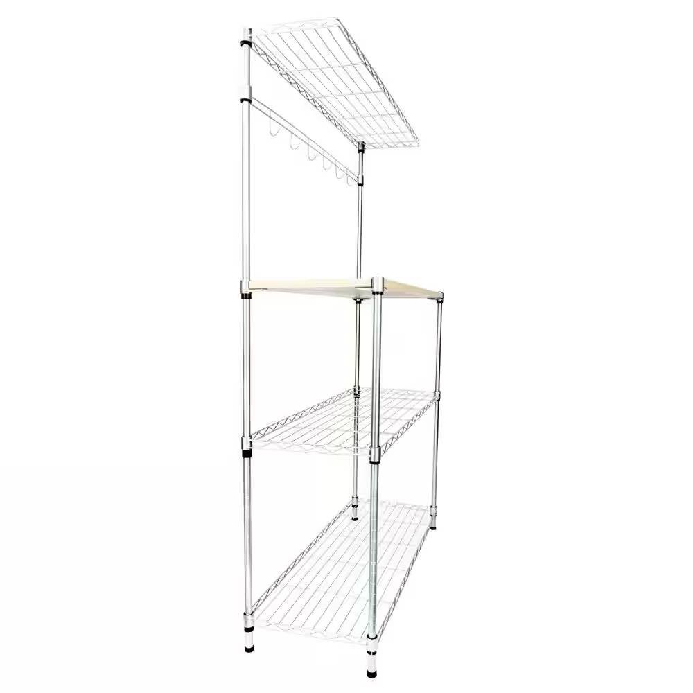 This Carbon Steel Kitchen Bakers Rack with MDF Wood Shelf and Hanging Bar with Hooks can easily turn any kitchen into the ideal storage and workspace. The three spacious lower shelves measure (35.75 inches x 13.5 inches) and carry a capacity of 88 pounds per shelf, with a top shelf that carries up to 6 lbs for your lighter food items. If you have taller items you can easily rearrange and adjust the shelf height in order to fit your larger items. Also includes rack hooks to hang a variety of things for quick, easy access.