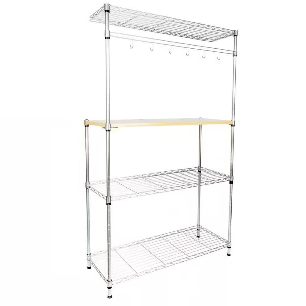 • Carbon Steel Kitchen Bakers Rack with MDF Wood Shelf and Hanging Bar with Hooks