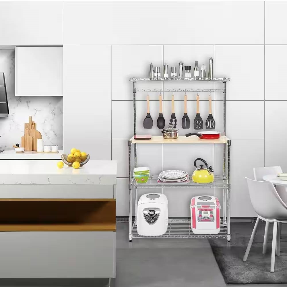 Carbon Steel Kitchen Bakers Rack with MDF Wood Shelf and Hanging Bar with Hooks
