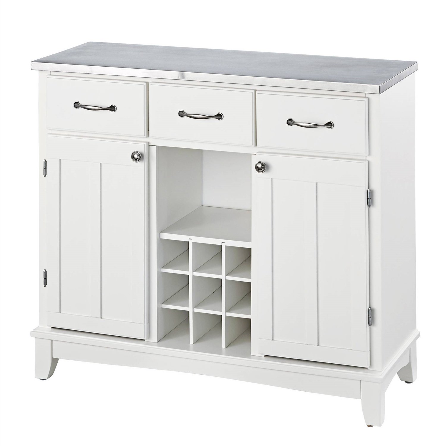 A great combination of elegance and function, this Stainless Steel Top Kitchen Island Sideboard Cabinet Wine Rack in White keeps your kitchen organized while making optimum use of your space. Made from quality stainless steel, hardwood and wood products, it has three utility drawers and two one-door cabinets with an adjustable shelf for plenty of storage. The wine storage area at the center can be removed for open storage if desired. The server base is available in a selection of finishes while the top comes in 18-gauge stainless steel. Overall Dimensions : 41.75W x 17D x 36.25H inches.