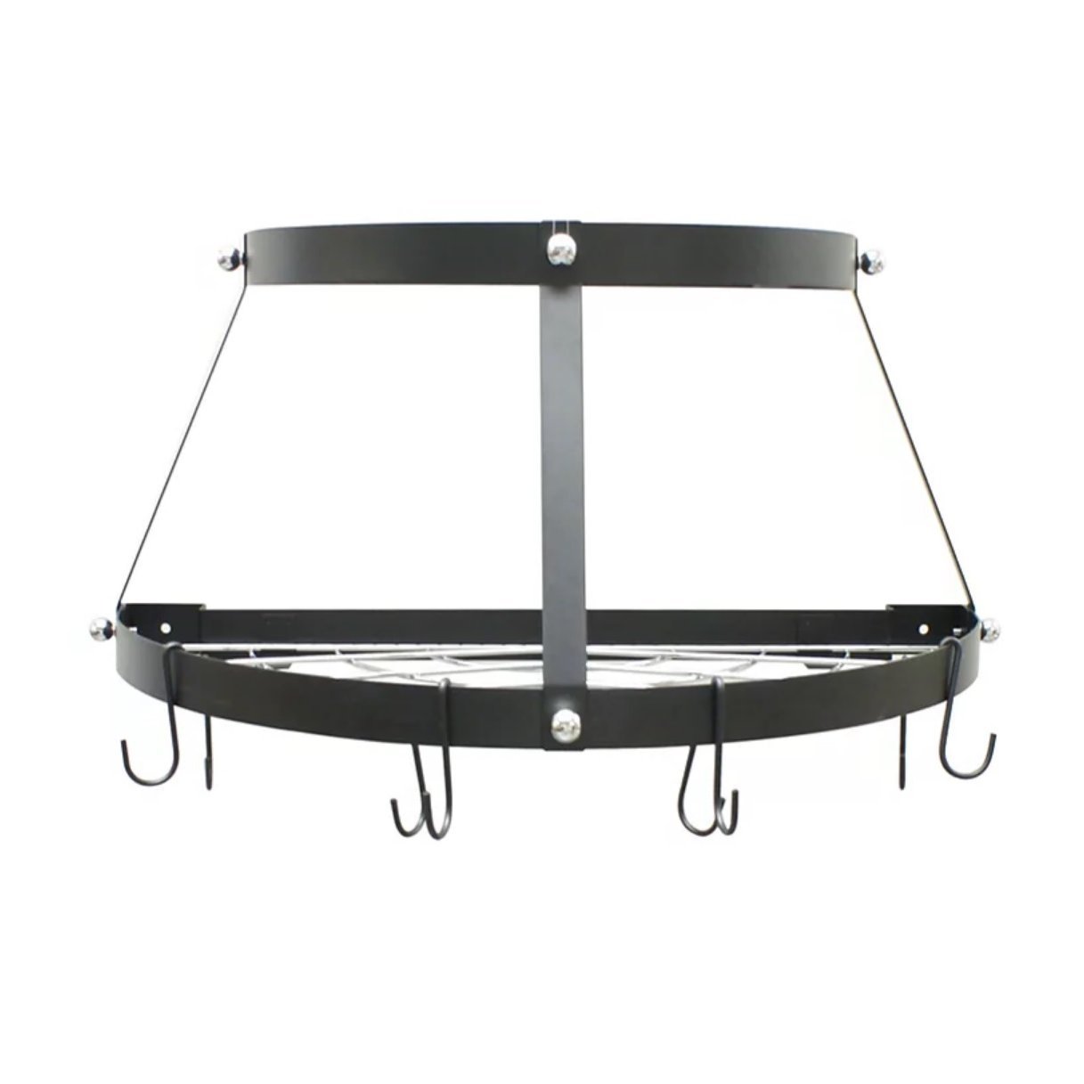 Arrange your cookware and utensils with this Modern Wall Mounted Enameled Double Shelf Pot Rack in Black. Easily access your hanging cookware and utensils with this wall-mounted rack! This attractive pot rack features upper shelf and repositionable hooks to maximize your space. You can hang over the stovetop, sink, kitchen island or any other desired area in your kitchen. Maximize your space with this stylish hanging rack, as seen in designer home magazines! Easy to assemble and install, the Black Enameled Wall-Mounted Pot Rack comes with complete hardware for installation.