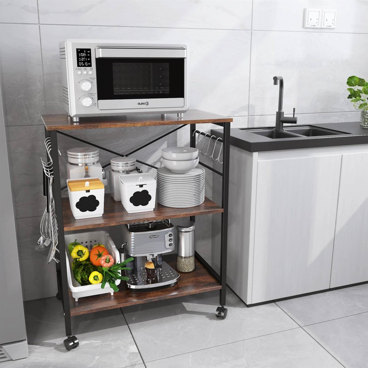 This Modern Industrial Black Metal Brown Wood Kitchen Baker's Rack Microwave Cart is an industrial storage stand for kitchen living room decoration. Put a microwave oven or other kitchen appliances on the sturdy top shelf and store toaster, spice, dishes, and any other utensils on the 2nd or 3rd tiers. Configured 10 steel hooks make it convenient and easy to hang some cooking tools. An odor-free and anti-mildew ensures durability in storage and decoration. Equipped with 4 flexible wheels, 2 of which are lockable, allow the cart table to go where you go to take advantage of your cabinet space. You can effortlessly wheel it to the living room, office, or bedroom as a kitchen appliance cart, coffee stand, small rolling bookshelf or small bakers rack. The locks will keep it in a fixed position when needed.