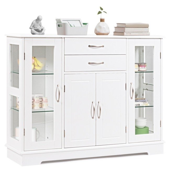 This White Wood 3 Tier Buffet Sideboard Cabinet with Glass Display Doors is ideal for you to store your supplies. Featuring 2 large drawers for convenient storage of cutlery, gadgets, and more. There are 2 adjustable shelves behind the single glass door and provide enough space for you to place crafts, dishes, toiletries, etc. The shelf behind the double-door is adjustable. Made with a well-crafted high quality density board and NC painter which are durable and waterproof.