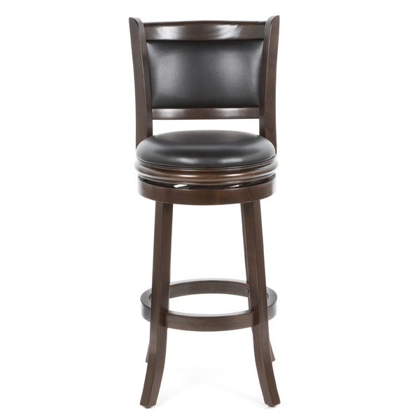 Accent your bar space with this classy and stylish 29-inch swivel bar stool. Its attractive and durable design is a perfect fit for all decor settings. It occupies less space and proves highly useful when you have guests at home.This stool has a solid hardwood construction that ensures it lasts for many years to come. The lustrous finish lends it a timeless look and adds to the appeal. It is fitted with a rich faux leather seat with high density foam to offer comfortable seating and enhance its appearance. It has flawlessly crafted French style legs with tempered bottoms. The steel ball bearings keeps it steady. The swivel ensures unrestricted movement. While the full ring footrest lends more strength and stability. The back support makes the seating experience more relaxed.The 29-inch bar stool has a weight capacity of 250lbs. Its seat height is 29''. The overall dimensions of the bar stool are 43.5-inch in height, 17-inch in width and 18-inch in depth. This stool is best paired with an elegant bar table to complete the sophisticated look of your decor.